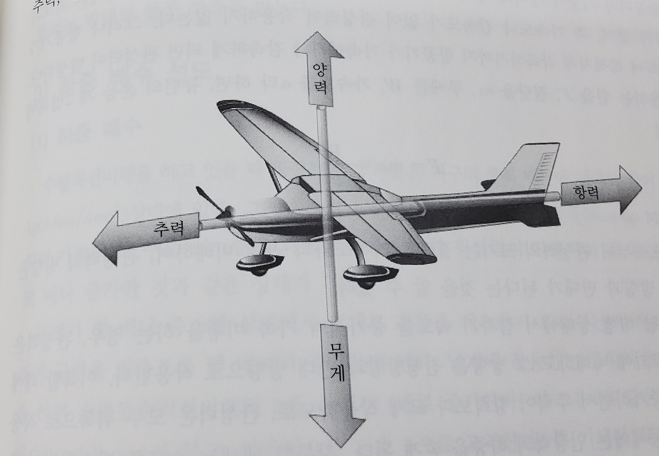 정상 비행을 하는 항공기에는 그림 1-1과 같이 엔진의 의한 추력, 항공기 무게, 공기력인 양력 및 항력이 작용하져