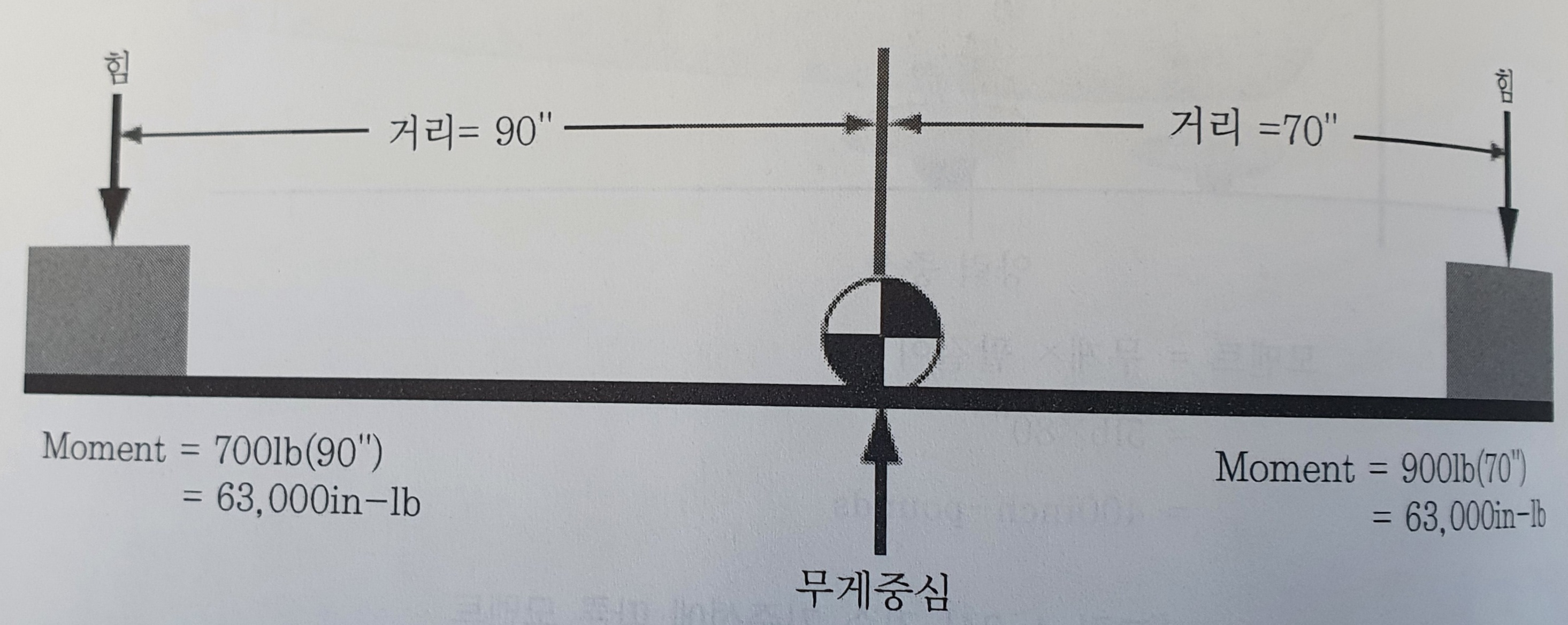 모멘트는 팔길이 곱하기 물체의 무게가 됩니다. 항공기 평형도 비슷해요