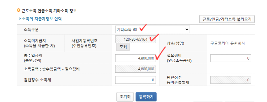 소득구분과 사업자등록번호를 입력하시고 [조회]를 누르시면 상호(성명)에 "구글코리아 유한회사"라고 나옵니다. 이후 21년도 애드센스 수입을 총수입금액에 넣어시고 등록하기 누르시면 됩니다. 이때 총 수입금액은 통장에 지급된 애드센스 수익을 더하셔서 입력하시면 됩니다.