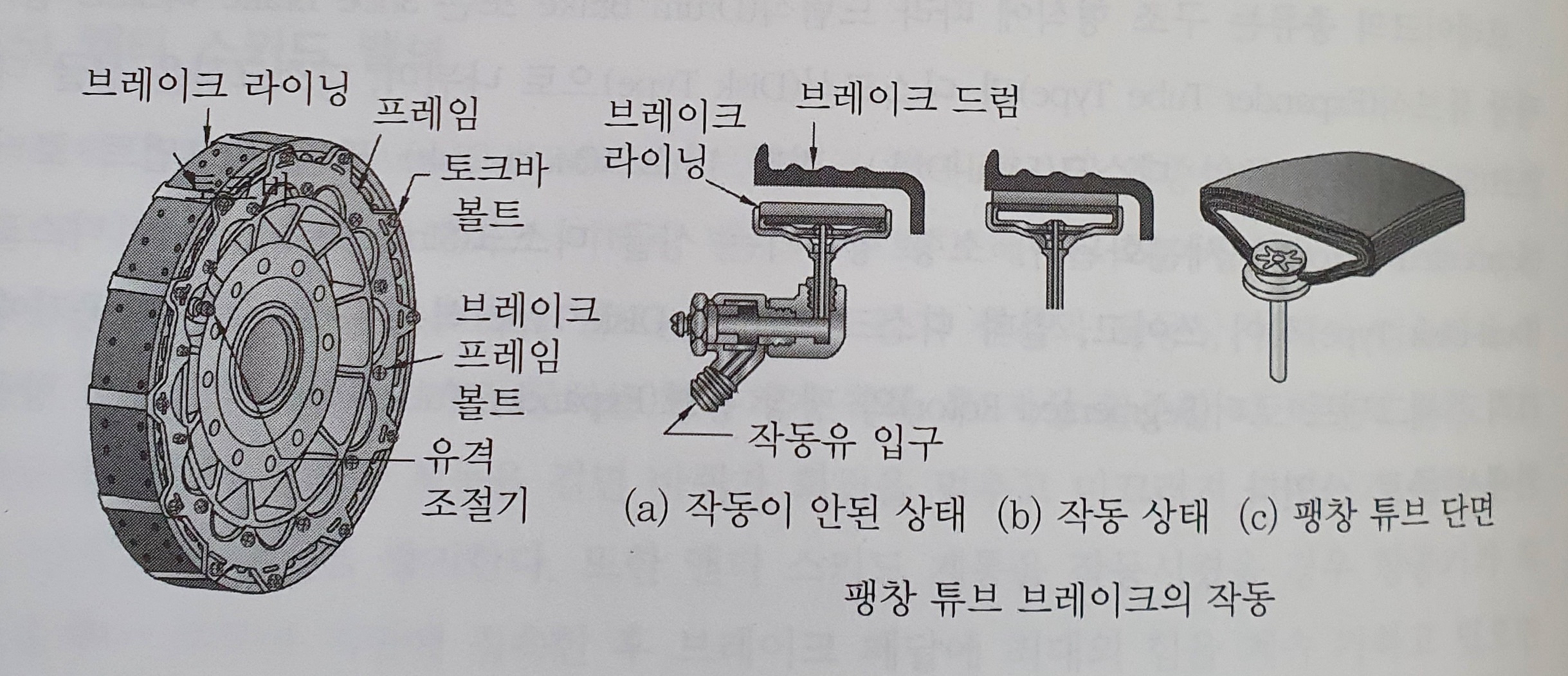 팽창 튜브는 둘레에 있는 브레이크 라이닝이 브레이크 드럼을 마찰하도록 밀어 바퀴를 제동하는데요