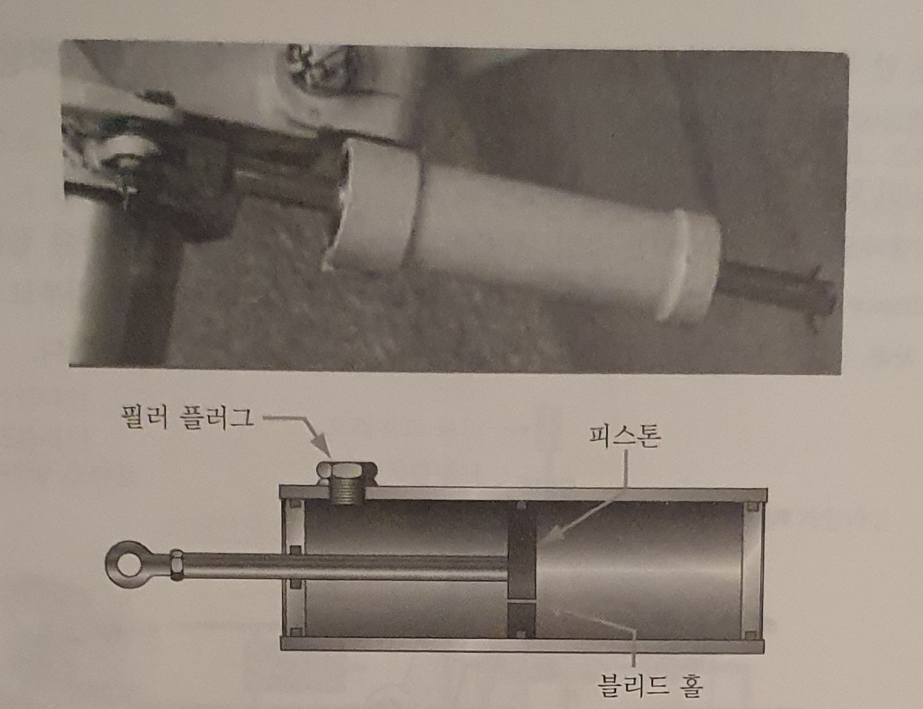 유압 보정기는 유압의 파동을 흡수하고 항공기 진행시의 앞 착륙장치가 좌,우로 진동하는 것을 막아주는 역할을 해요