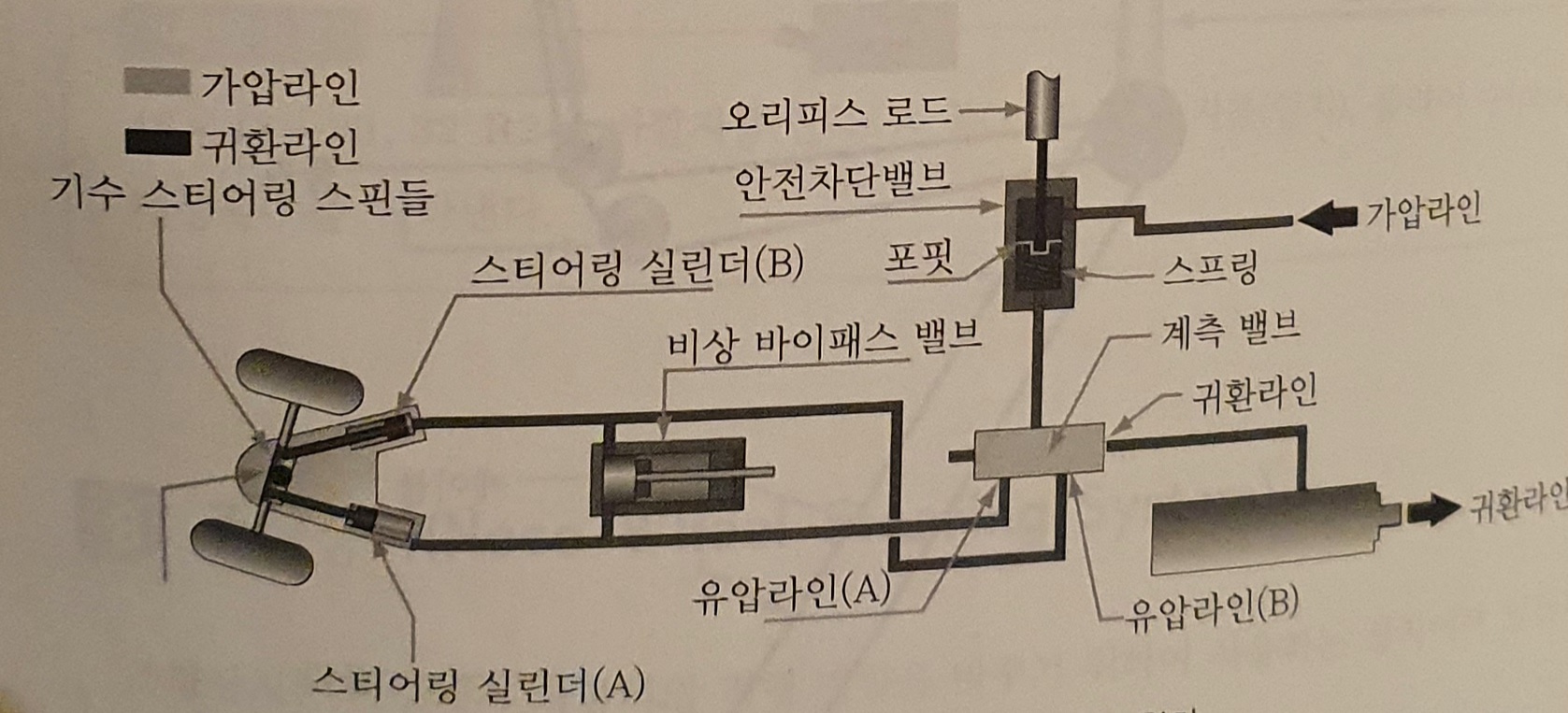 방향키 페달, 스티어링 휠, 스티어링 미터링 밸브, 시미댐퍼 3가지, 스티어링 실린더, 토션링크, 비상 바이패스 밸브는 꼭 기억하시고 2~3번 읽어보세요