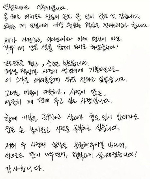 2023년 이승기는 자필편지를 통해서 이다인에 대해 "마음이 따뜻하고 사랑이 많은 영원히 제 편에 두고 싶은 사람이다. 함께 기쁨을 공유하고 살다가 힘든일이 있더라도 잡은 손 놓지 않고 시련을 극복하고 싶다"라고 결혼을 발표했습니다.