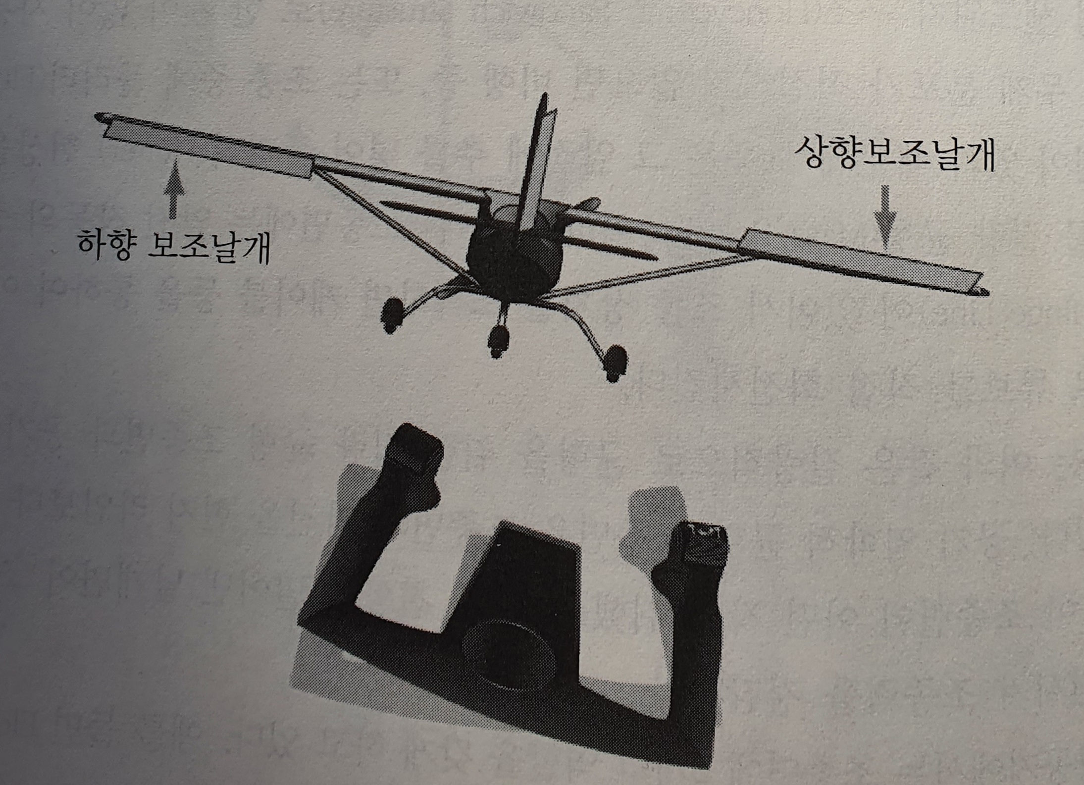 보조날개는 조종 바퀴를 좌우로 회전시키거나 혹은 조종간을 좌우로 밀어서 작동시키죠