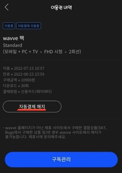 - 하단에 [자동결제 해지] 버튼을 클릭