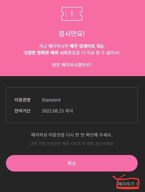 - 해지 신청을 취소하고 자동결제를 다시 유지하고 싶으면 다음날 부터 이용권 만료일 하루 전까지 자동결제 해지 취소 가능