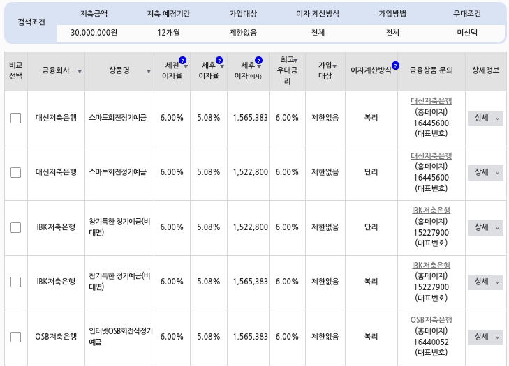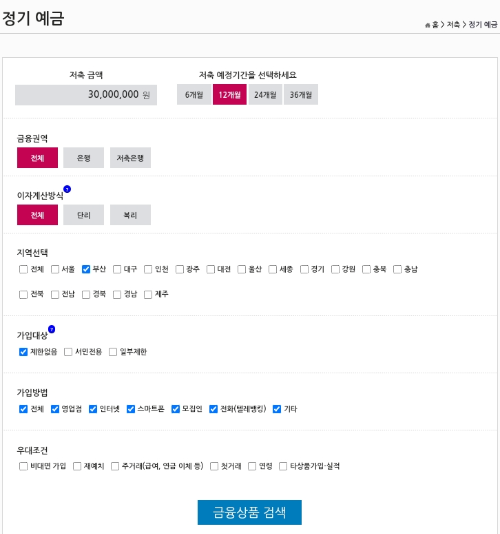 4. 위 사진에서 보시는거와 같이 [저축금액 : 3천만원] [저축기간 : 12개월] [금융권역 : 전체] [이자계산방식 : 전체] [지역선택 : 부산]으로 임의로 해서 금융상품을 검색하여 보았습니다.