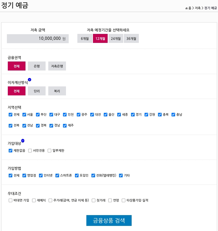 3. 내가 원하는 저축금액이나 예정기간 등을 선택해서 금융상품 검색이 가능합니다. 저는 금리때매 저축은행을 선호하는 편입니다.