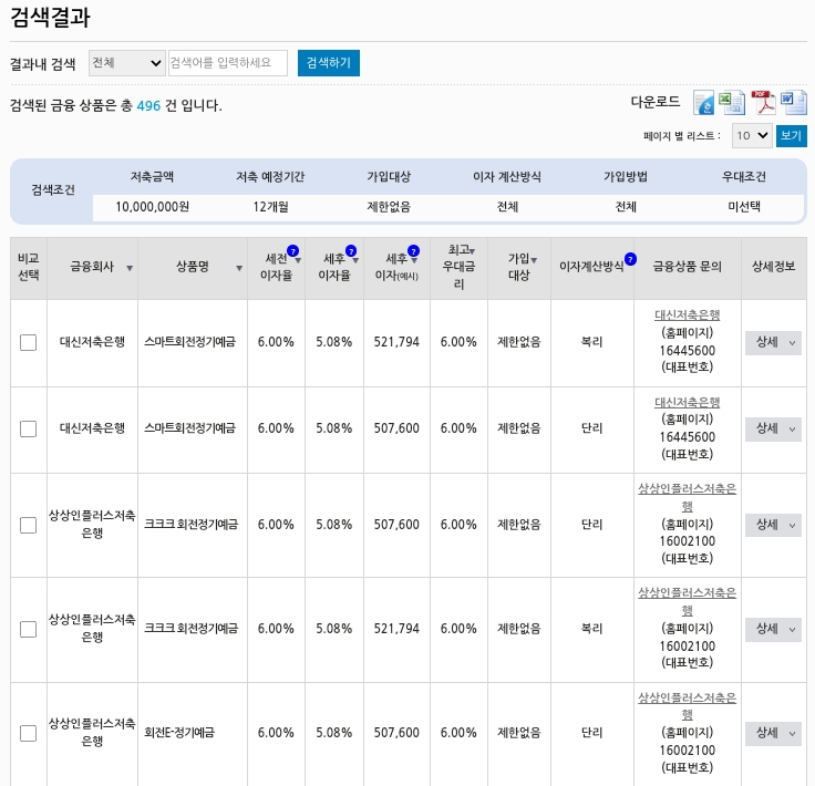 일단 전국 은행 및 저축은행을 대상으로 정기예금 이율높은 곳 5군대를 확인해봤습니다. 다만 가입대상, 가입방법, 우대조건 등은 제가 임의로 정했기에 보다 정확하게 알아보시는 방법을 아래에 설명드리겠습니다.