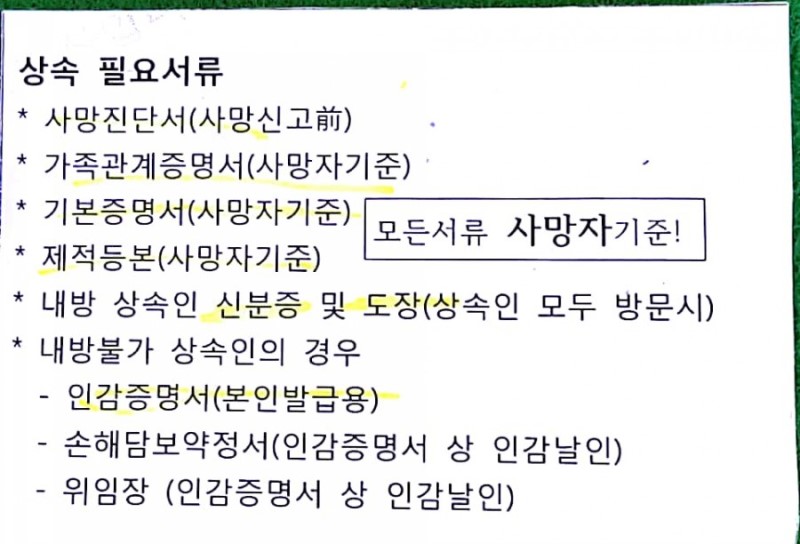 - 내방불가 상속인의 경우 : 인감증명서(본인발급용), 손해담보약정서(인감증명서 상 인감날인), 위임장(인감증명서 상 인감날인)