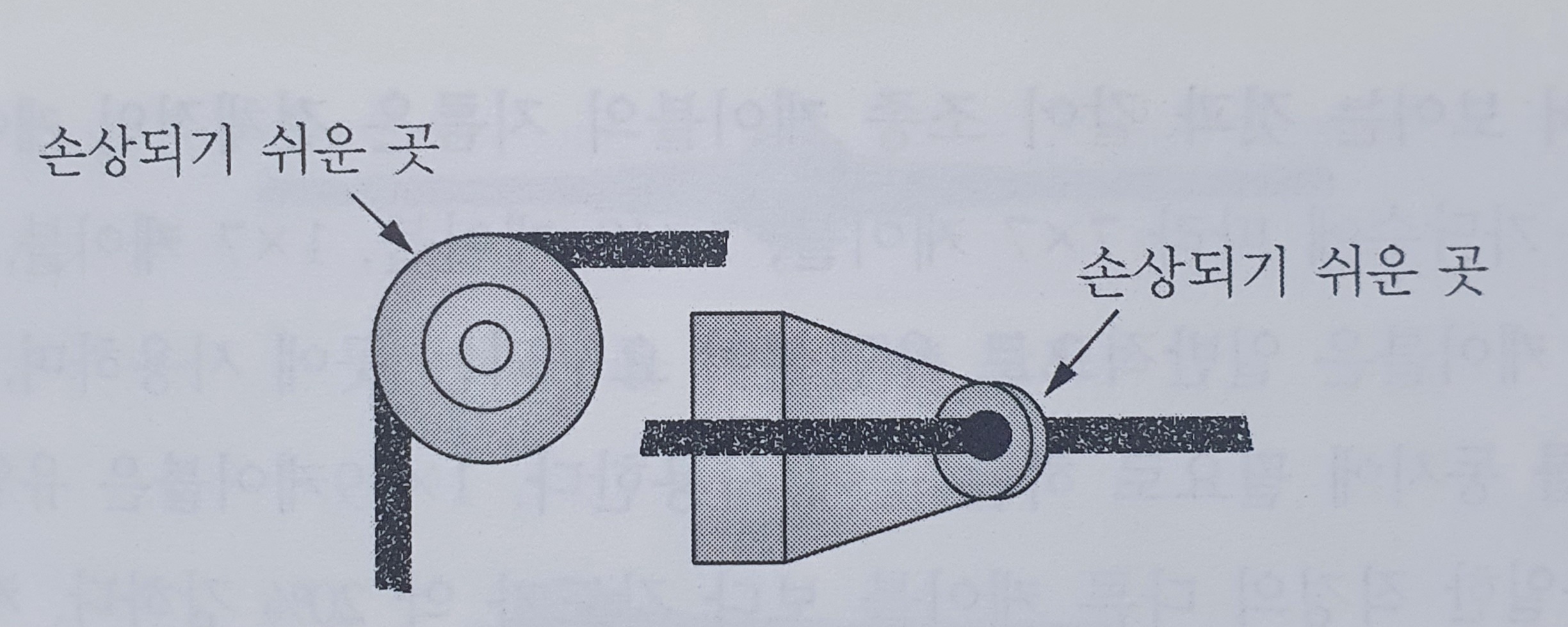와이어가 끊어지는 것은 케이블이 풀리위나 페어리드를 통과하는 곳에서 가장 많이 일어나는데요 전형적인 손상 위치를 그림 1-4에 나타냈어요