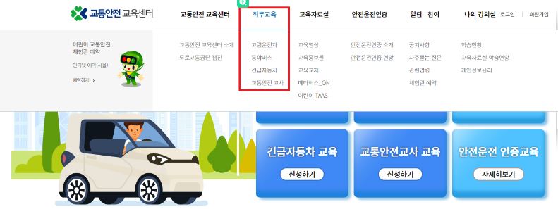 - 홈페이지 상단 '직무교육' 메뉴 중 원하시는 교육을 클릭하여 이동합니다.