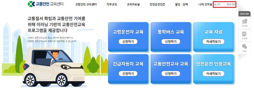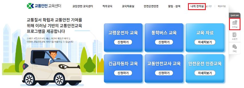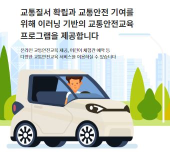 도로교통공단 이러닝센터 홈페이지에서는 [고령운전자 교육] [통학버스 교육] [긴급자동차 교육] [교통안전교사 교육] [어린이 교통안전 체험관] 등 교통질서 확립과 교통안전 기여를 위해 이러닝 기반의 교통안전교육 프로그램을 제공합니다.