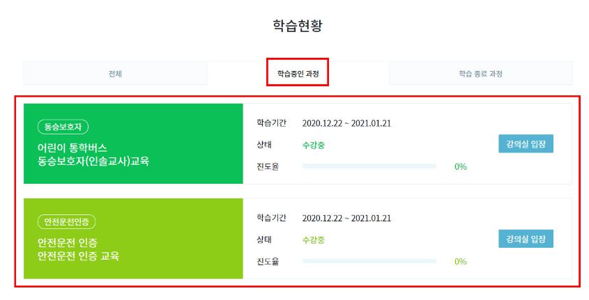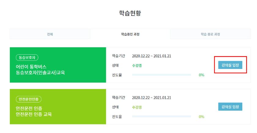 - '나의 강의실 > 학습현황 > 학습중인 과정'의 목록에서 학습할 과정의 '강의실 입장'을 클릭하면 해당 교육과정의 강의실로 이동하게 됩니다.