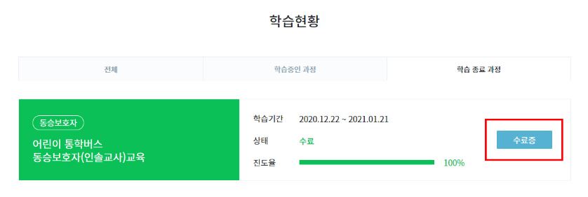 - 학습을 종료한 과정의 목록에서 '수료증'을 클릭하여 해당 과정의 수료증을 출력합니다. 수료증은 PDF 파일 형태로 저장이 가능합니다.