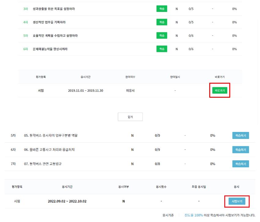 - 시험이 있는 과정의 경우 학습 수강을 100% 완료하신 뒤 차시 목록 하단의 '시험보기'를 클릭하여 시험에 응시하실 수 있습니다.