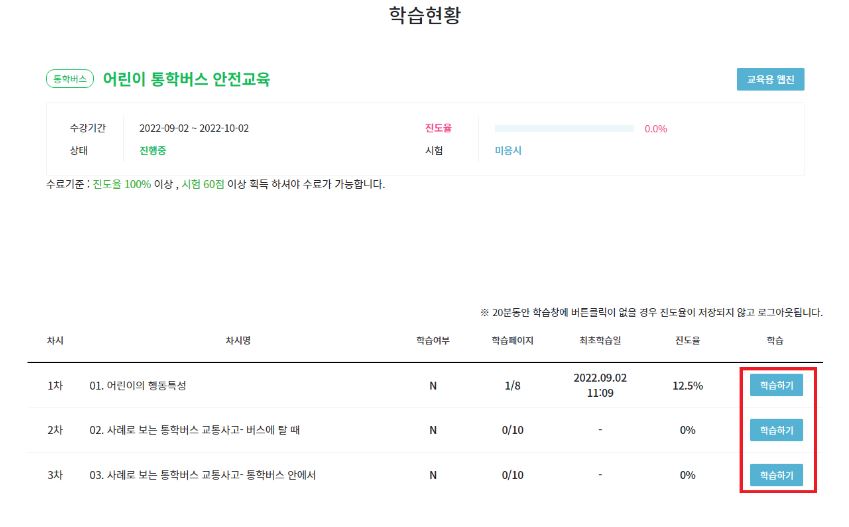 - 강의실에서 '학습하기'를 클릭하면 해당 교육과정의 학습을 진행하실 수 있습니다.