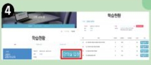 ㅁ) [나의 강의실] -> [학습현황] 에 가셔서 [강의실 입장] 을 통해 온라인 교육이 가능하며 모든 교육이 종료되면 학습현황에서 [수료내역] 확인이 가능합니다.