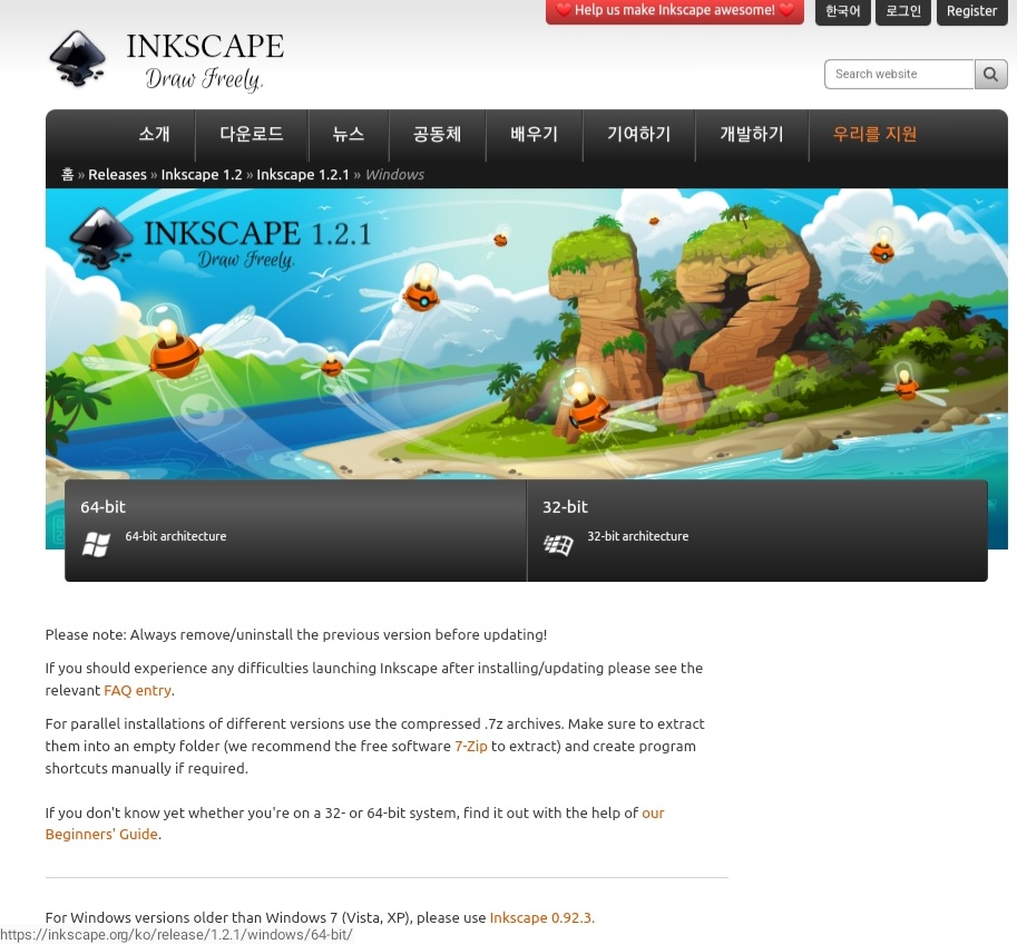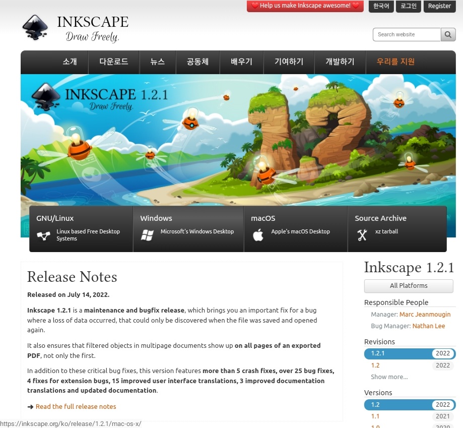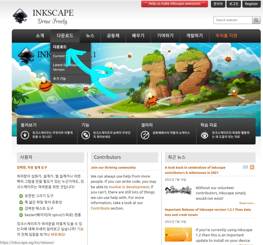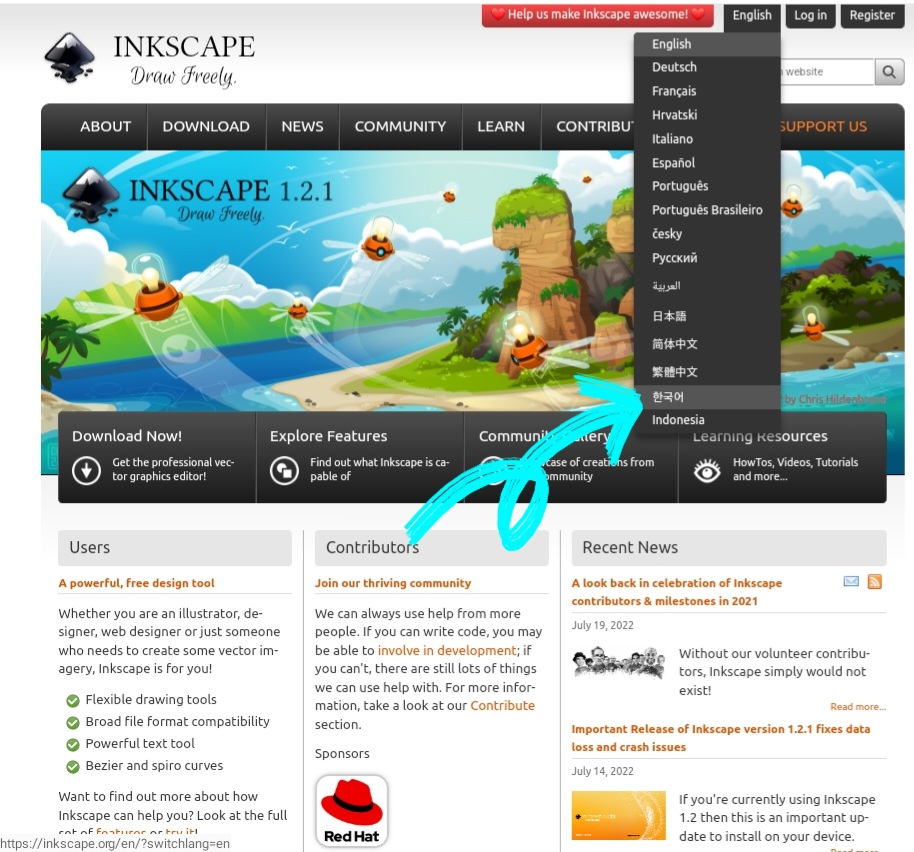 1) 잉크스케이프 사이트에 접속하세요. 접속하시게 되면 영어로 되어 있을텐데 한국어를 원하시게 되면 우측상단에 English를 누르게 되면 한국어로 변환이 가능합니다.