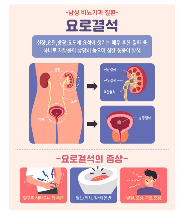 요로결석은 소변이 만들어지고 배출되는 경로에 결석이 생기는 질환이에요. 통증은 결석의 위치에 따라 다르게 나타나고, 요관에 결석이 걸리면 심한 통증이 발생할 수 있습니다. 방광에 결석이 생기면 배뇨 시 통증이 심해질 수 있어요. 작은 결석은 자연적으로 배출되지만, 큰 결석은 수술적 치료가 필요할 수 있습니다. 예방을 위해서는 충분한 수분 섭취와 고단백 식이 조절이 중요해요.