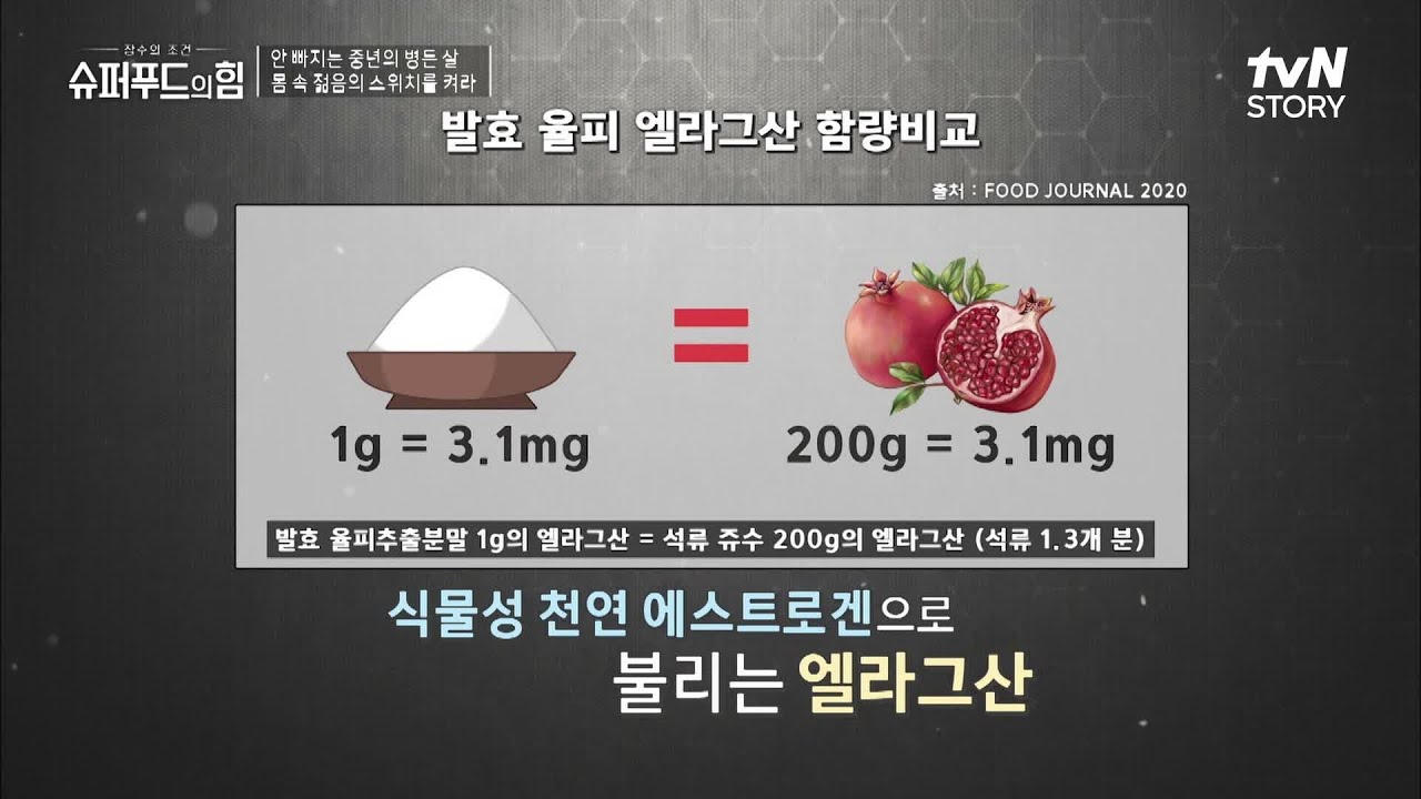 엘라그산과 같은 페놀성 피토케미컬은 과일과 채소 등의 생존과 성장에 중요한 성분으로 사람이 섭취하면 각종 심혈관 뇌, 암 질환과 같은 산화 관련 만성 질환에 대한 예방과 치료에 도움이 될 수 있습니다. 또한, 엘라그산은 항산화 항염증제로 직접 적으로 작용해, 세포 수준의 항산화 효소를 활성화 유도함으로써 산화 스트레스의 부정적인 영향을 상쇄함으로써 기능하는 것으로 밝혀졌습니다.