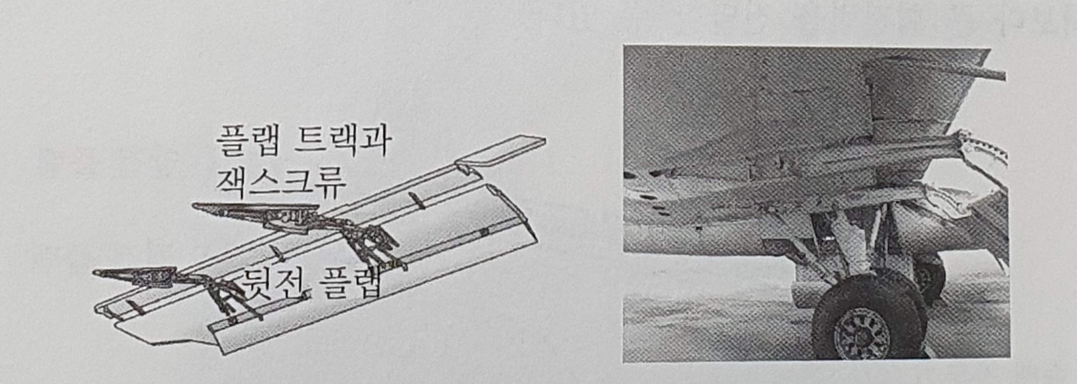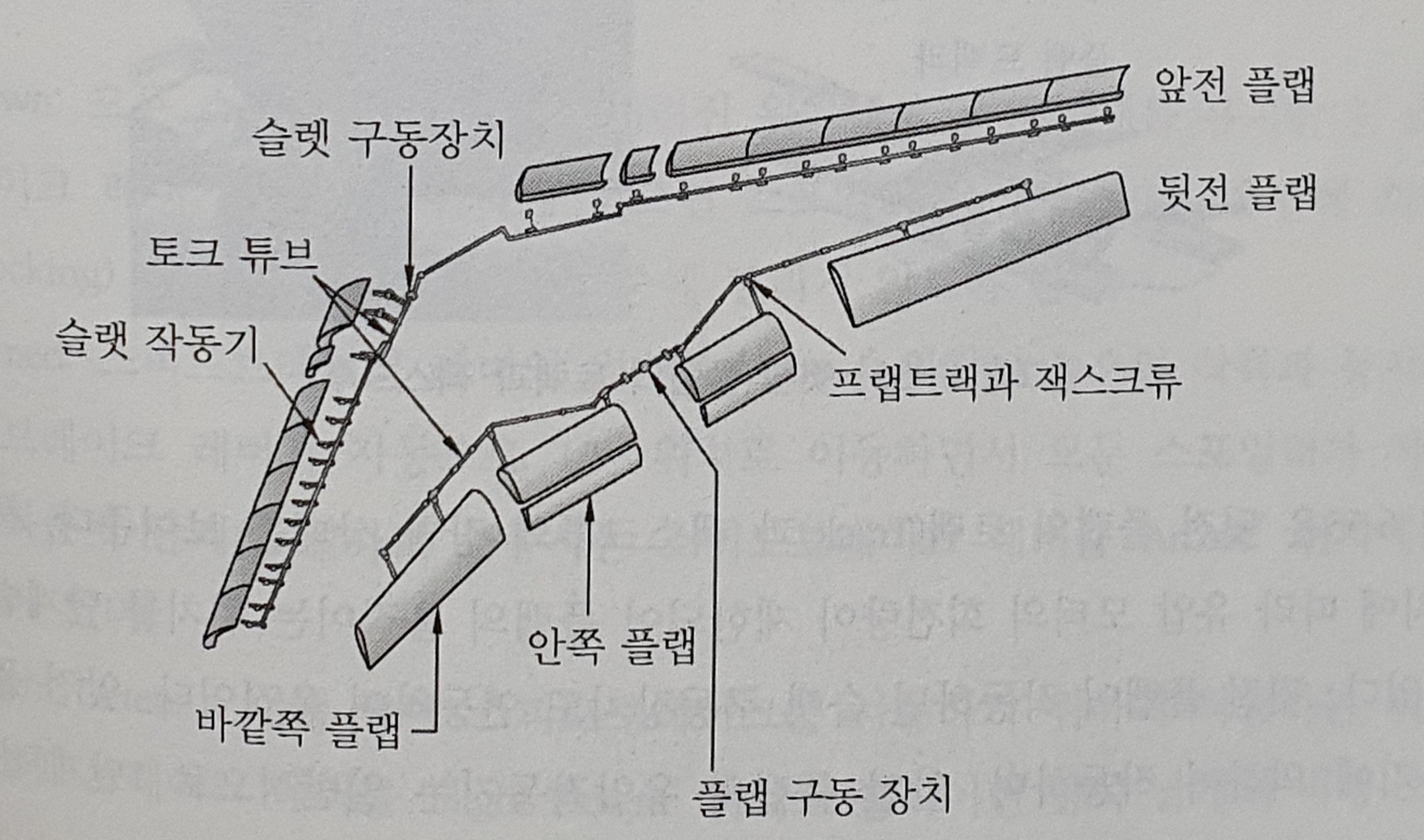 그림 1-4는 뒷전 플랩의 트랙과 잭스크루의 장착 상태를 보여줍니다. 플랩 레버의 위치에 따라 유압 모터의 회전량이 제한되어 플랩의 움직이는 위치를 단계별로 조절할 수 있어요. 뒷전 플랩이 작동하면 슬랫 구동장치도 연동하여 움직이는데요. 앞전 플랩은 유압작동기에 의하여 작동하며, 앞전 플랩의 유압작동기는 일반적으로 1단계(접힘-펼침) 또는 2단계 (접힘-중간 펼침-펼침)로 움직이죠