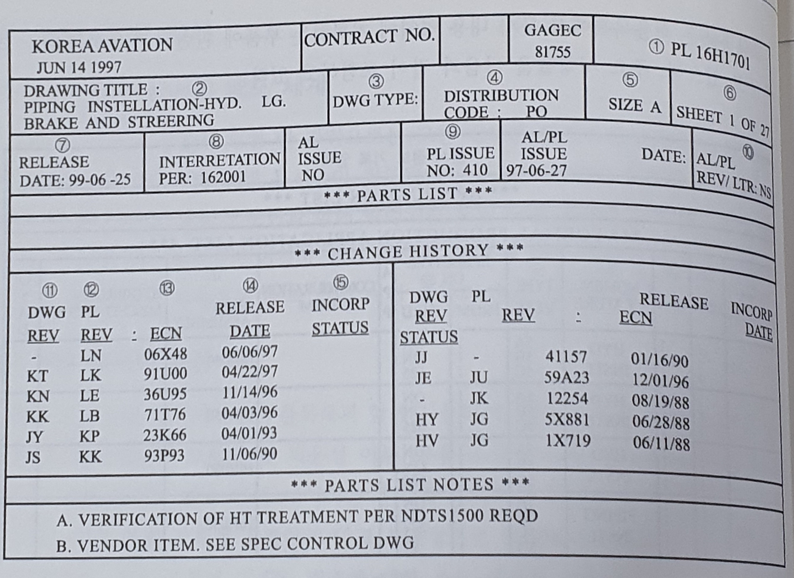 해당 도면상에 명시되거나 부품목록과 함께 사용되어 적용 목록에 다음 조립 및 장착품 번호, 장착항공기 모델명 및 적용성 여부, 부품 소요량 등이 명시된다.