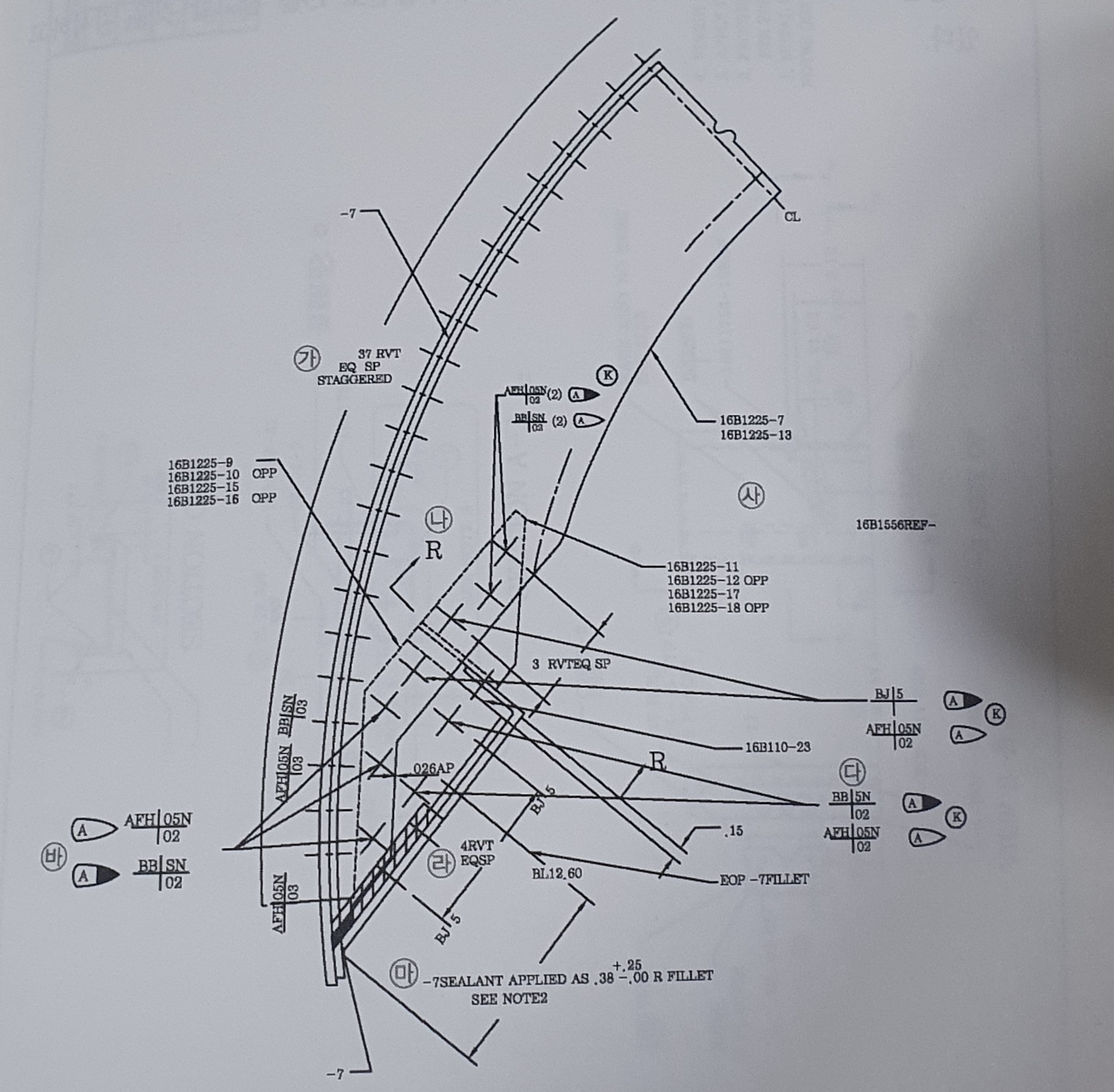 (5) -7 SEALANT APPLIEDAS .38+0.25 / -.00 R DIKKET : 부품번호 -7은 밀봉재를 라운드 반경이 0.38인치에 +공차가 0.25이내 -공차는 허용되지 않도록 하는 필릿 작어을 나타낸다