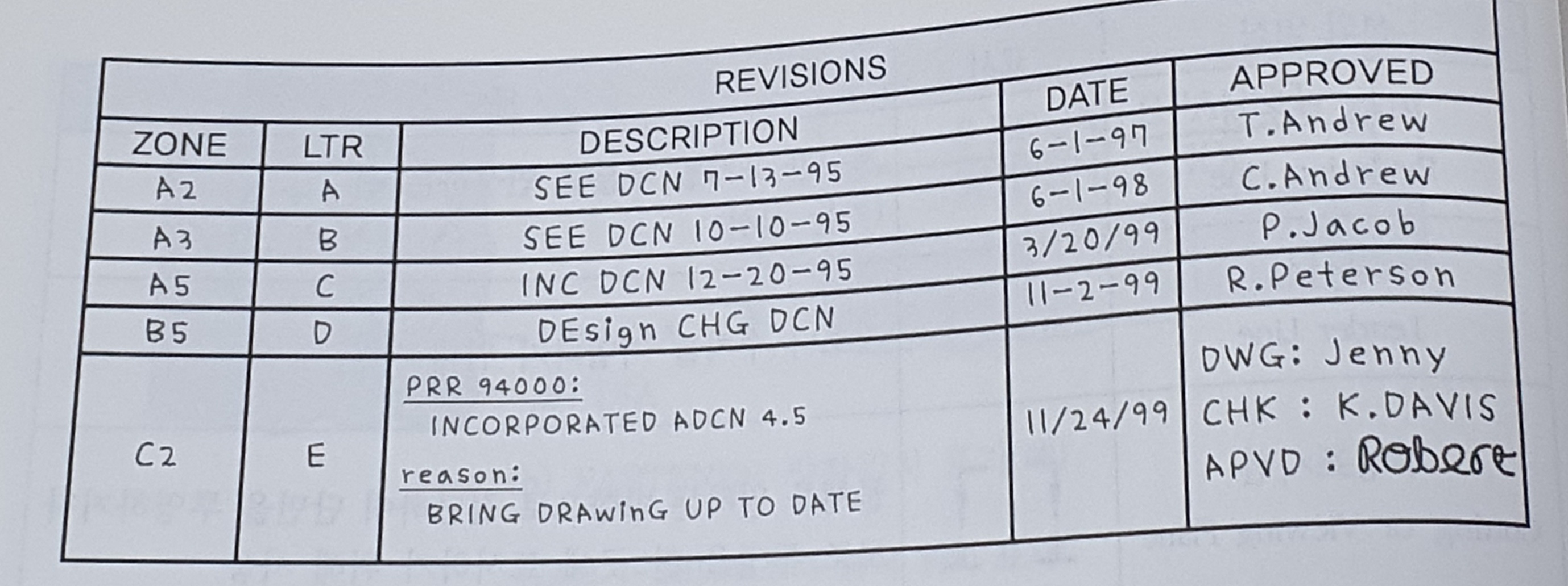 도면의 우측상단에 위치하며, 도면이 변경되면 기술변경서 또는 우선 도면 변경서의 양식을 사용하여 변경된 사항을 기록하게 되는데 도면의 변경란에는 도면의 변경이유, 변경날짜, 변경내역, 변경인가자, 변경시킨 제조사를 쓰게 된다